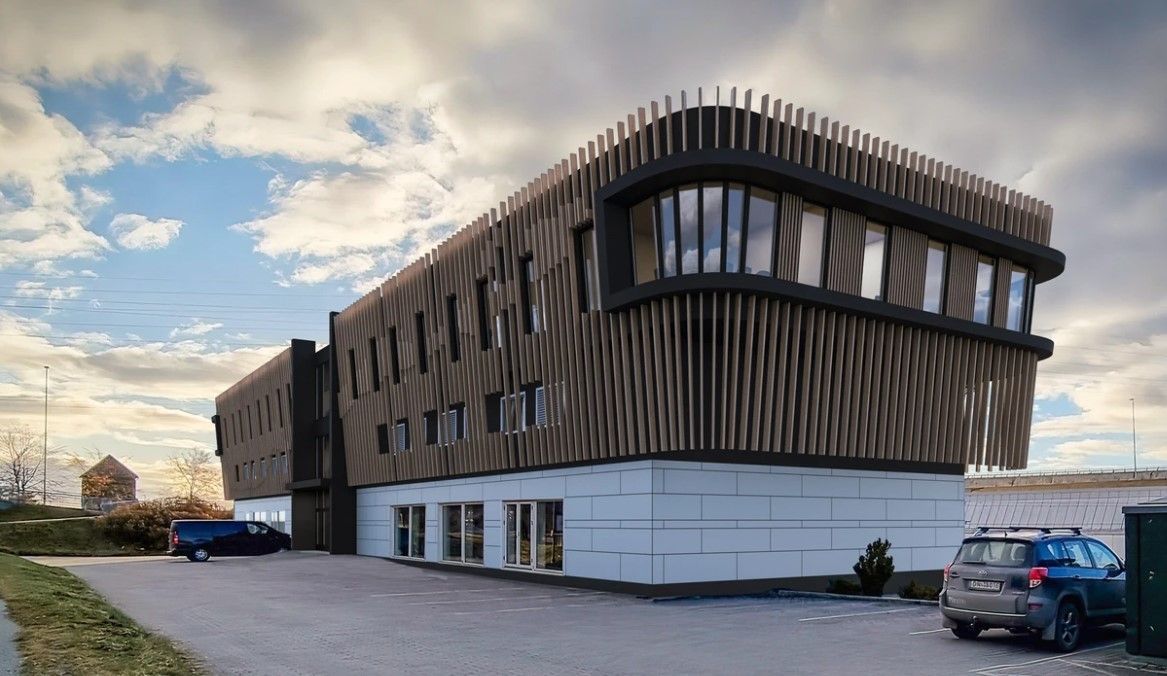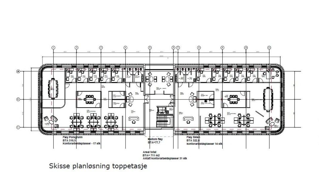 Bygget i dag er fullt utleid. Det er planer om en toppetasje med fantastisk utsikt. Etasjen er delt i to - Porsgrunnsfløyen og Skiensfløyen. Totalt 711m2. Du vil da ha mulighet til 25-30 kontorplasser. Det er også mulig for to bedrifter å dele disse lokalene, men 12-15 på hver. Planløsning kan diskuteres med utleier, og tilpasses leietager. Heis.