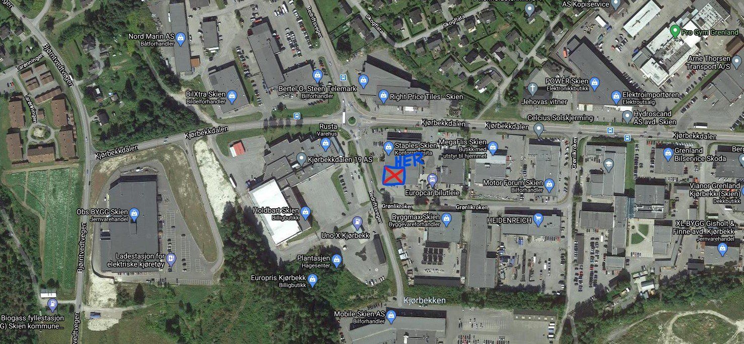 ca. 1500 m2 butikk og lager ledig fra 01,mai 2021. Ligger sentralt til mellom ByggMax, Uno X, Plantasjen, Europris, Holdbart, Rusta, Suppeguri, T Hansen, Staples og Skeidar.